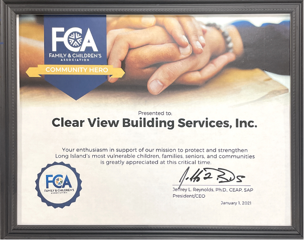 Clear View Building Services was proud to participate in Family & Children’s’ Association (FCA), Adopt a Family. Each year, FCA’s Adopt-a-Family campaign has helped to brighten the holiday season for many Long Islanders in need. The heartfelt initiative provides opportunities for individuals, families, organizations, corporations and schools to donate gifts to FCA’s program participants. Presents are distributed according to a wish list that donors receive, comprised of items ranging from clothing to electronics.