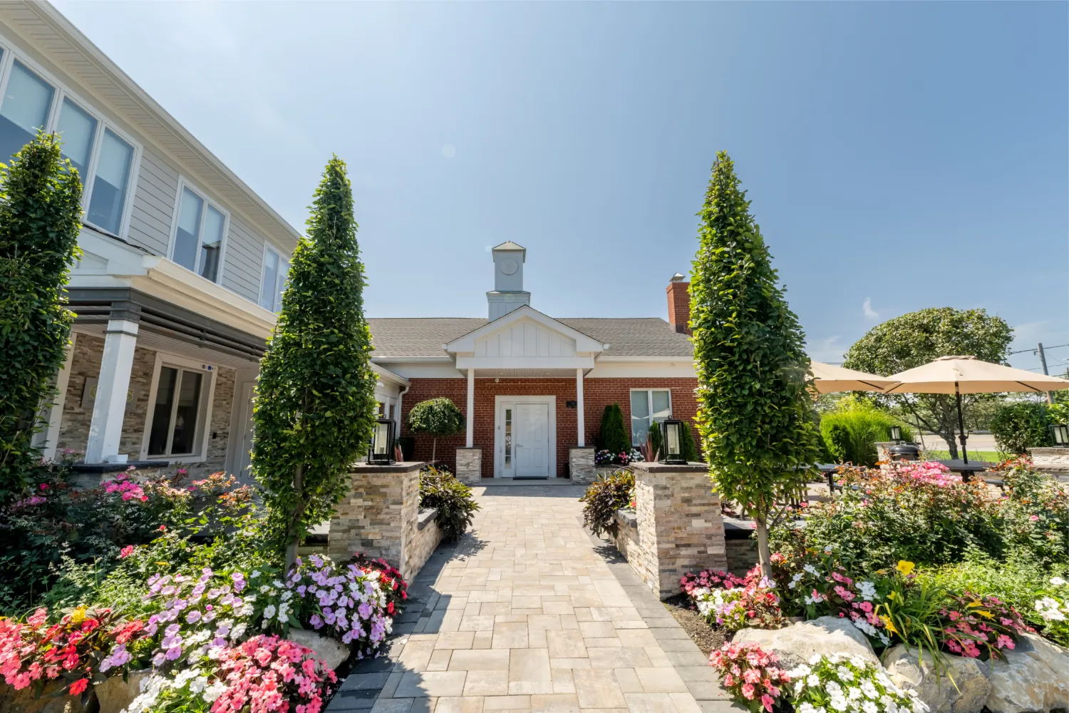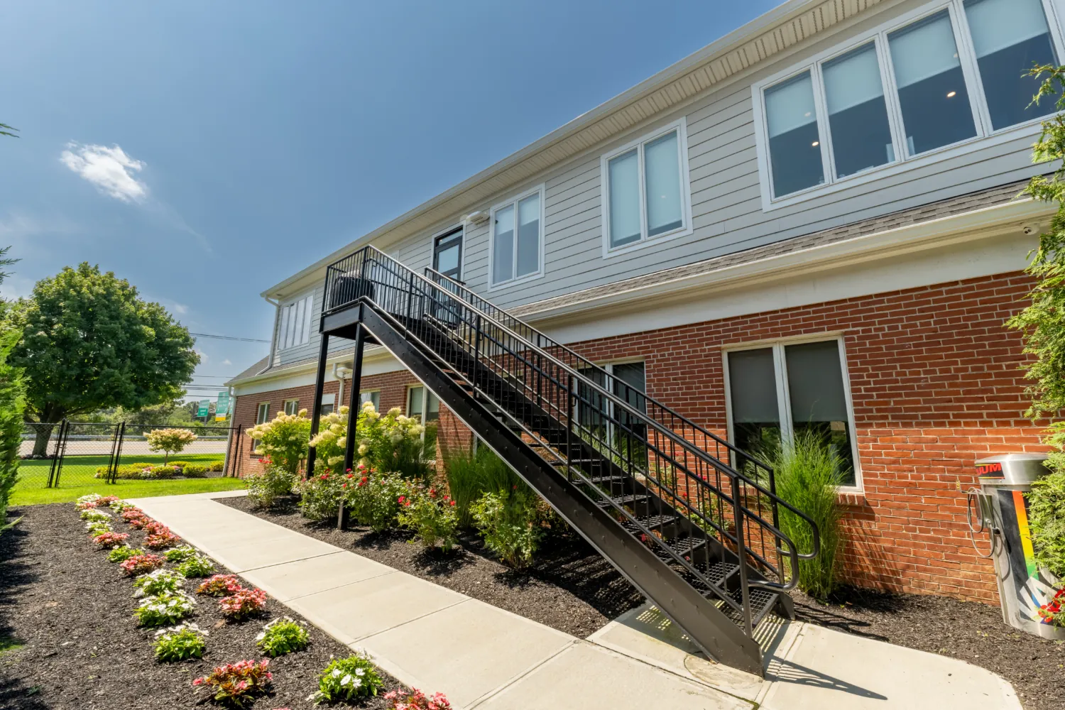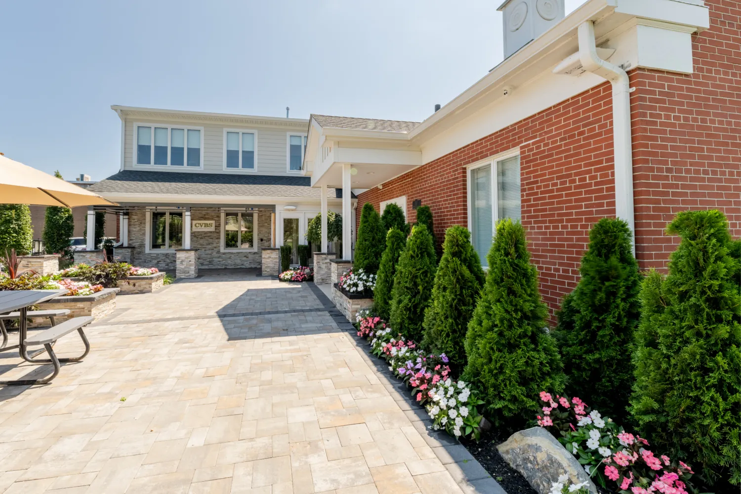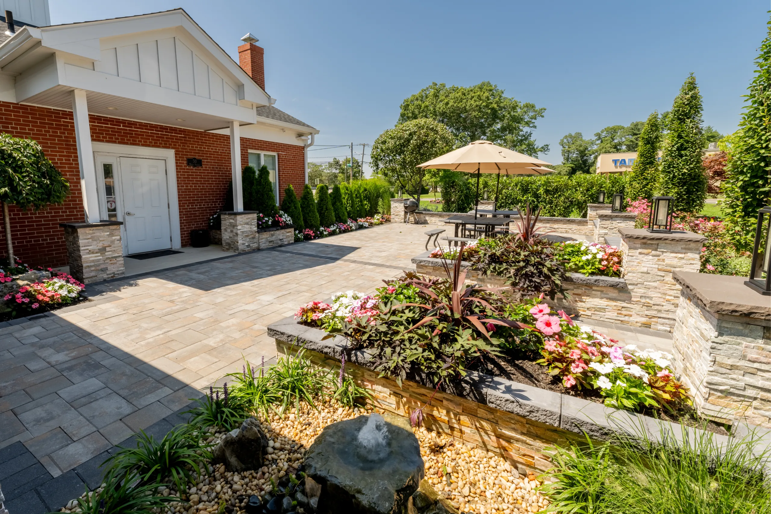 This project started with the CVBS team designing a sketch for upgrades to the outdoor patio at our office. The goal was to build a comfortable and bright space for team members to take breaks and for company gatherings and events. The construction consisted of a new concrete base for a new patio, columns with lighting, low voltage landscape lighting, and a new landscaping package that included a water feature!